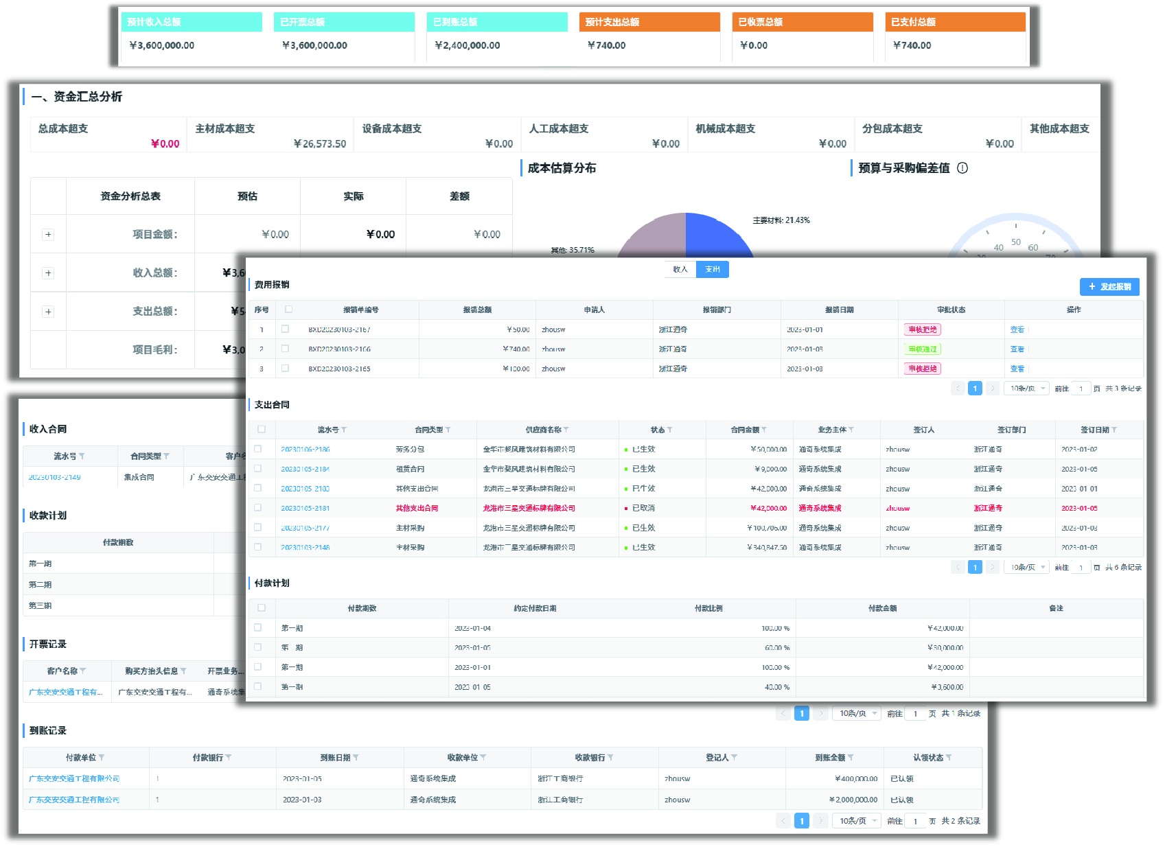 面向检验评测企业提供一体化数字管理解决方案,通过资金管理、成本管理、物资管理、财务全流程、全数据管理等功能模块使执行人员业务流程标准化、透明化,提供多维度项目经营数据分析报表,让管理者实时了解公司项目的整体运营效率及效益是否达标、经营风险是否可控,满足检验评测企业数字化管理升级的需求,提升企业经营管理能力。